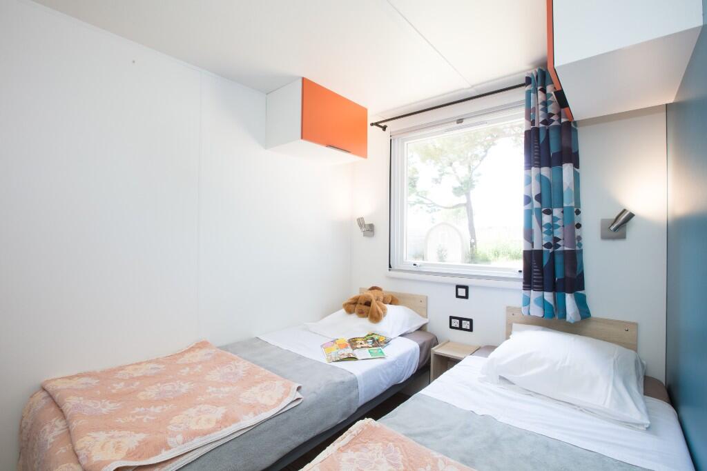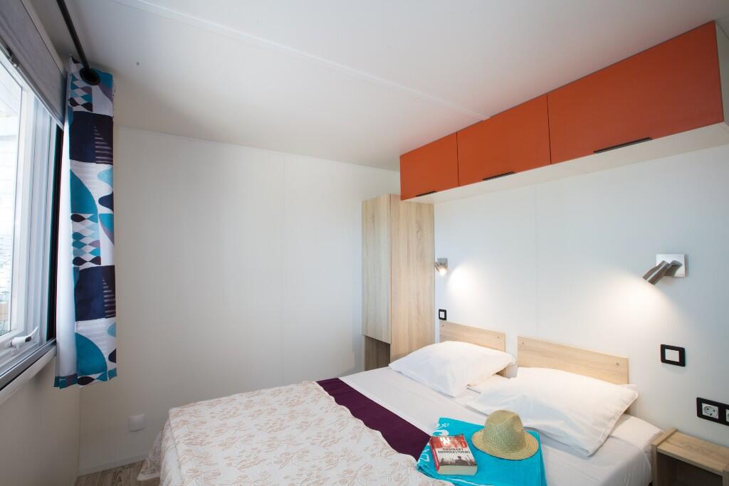 Im Schatten der Kiefern gelegen, verbindet das Sunêlia CONFORT PINEDE perfekt Ästhetik und Komfort. Mit 25 m², 2 getrennten Schlafzimmern, eines mit einem 140 x 190 Bett und das andere mit zwei 80 x 190 Einzelbetten. Ausnahmsweise hat das Kinderbett* seinen Platz im Elternschlafzimmer. Die Küche und das Wohnzimmer öffnen sich zu einer 10 m² großen, halboffenen Terrasse, die bei jedem Wetter einen zusätzlichen Platz im Freien bietet. Eine zusätzliche Holzterrasse ist mit Gartenmöbeln ausgestattet. Haustiere sind unter unseren Bedingungen erlaubt.