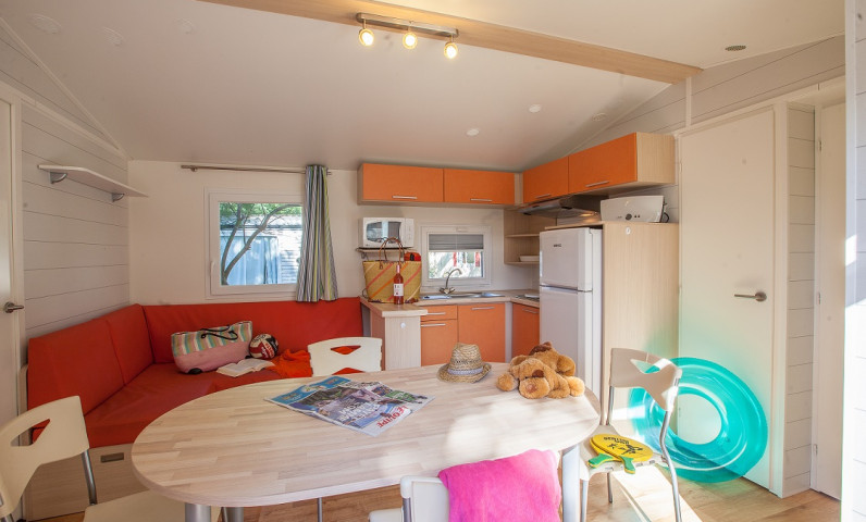 La cocina, funcional y bien equipada, se abre al salón y facilita el día a día, para unas vacaciones sin preocupaciones. Climatizada y equipada con televisión, la casa móvil garantiza un confort apreciable durante toda la estancia.