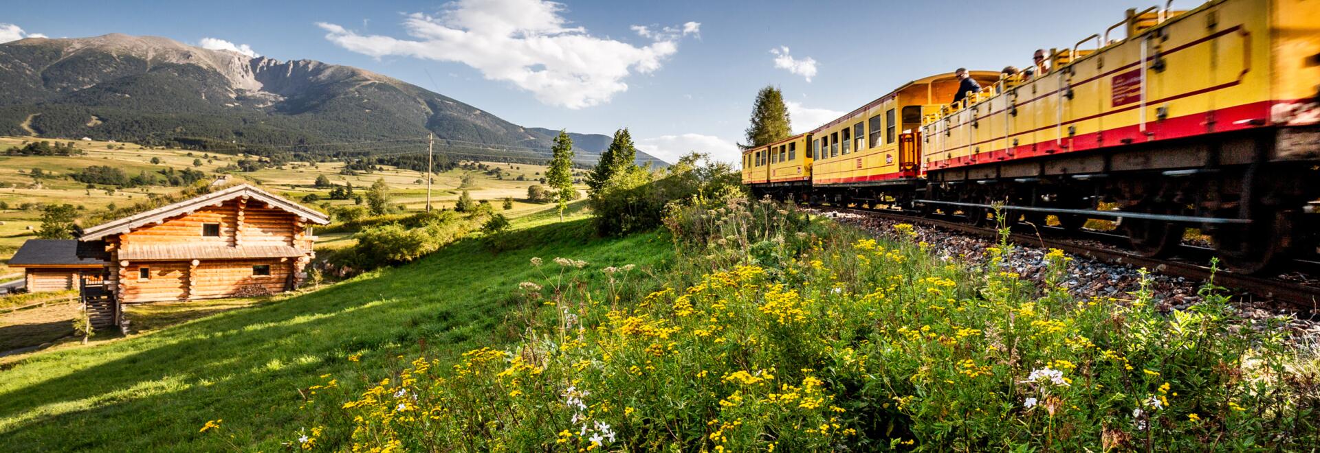 Le petit train jaune sillonne la région de la Cerdagne. Cette haute plaine est appréciée des randonneurs pour ses paysages sauvages, ses lacs et stations de ski. À bord du « Petit Train », on peut apercevoir des villages typiques du Haut-Conflent et plusieurs massifs des Pyrénées orientales : Canigou, Cambre d’Aze, Carlit et Puigmal.