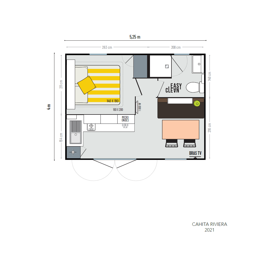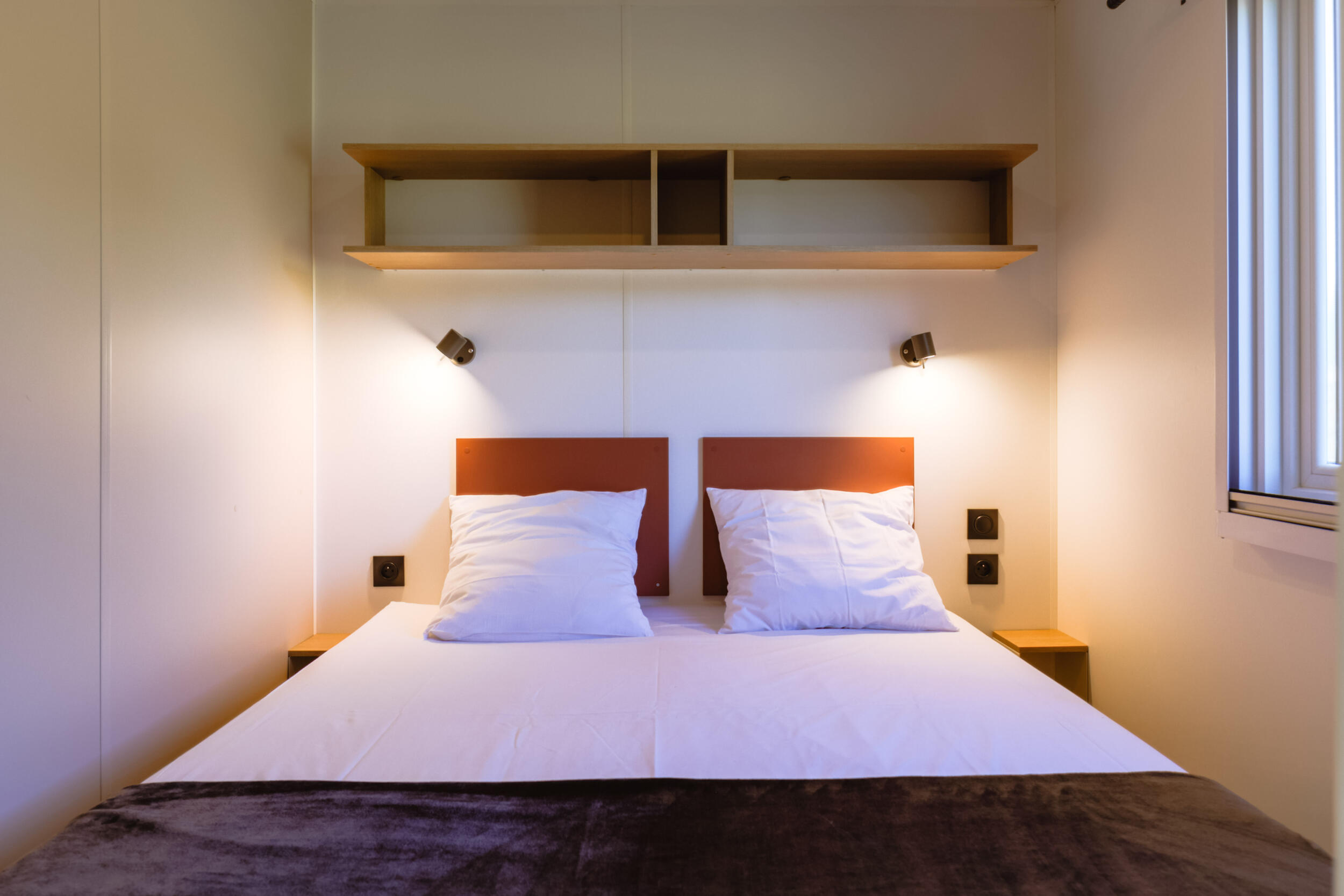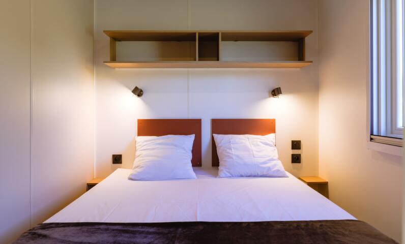 La chambre, véritable refuge, accueille un lit confortable agrémenté de rangements intégrés pour que tout trouve facilement sa place. La salle d’eau, fonctionnelle et élégante, complète cet espace intime pensé pour les couples en quête de confort et d’évasion.